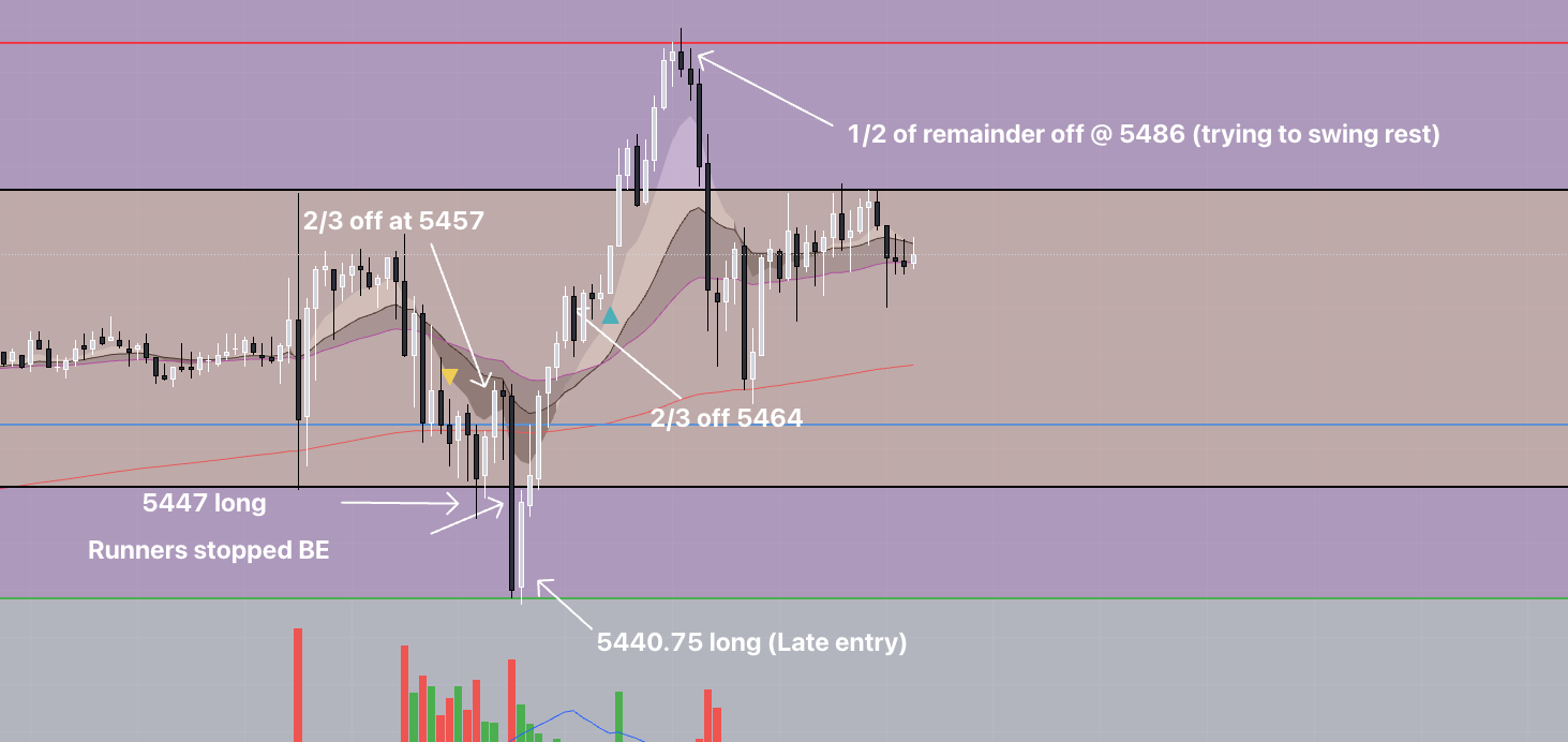 I took two trades again today. The initial fail to break below the box, with runners stopped at BE. Then another for the test of the bottom of the 4H box. I wanted to play a failed breakdown of this level, but only got to 1/3 size (no swipe below) which is why I systematically enter these trades at big levels. Runners are still alive for this one, SL currently 5454.